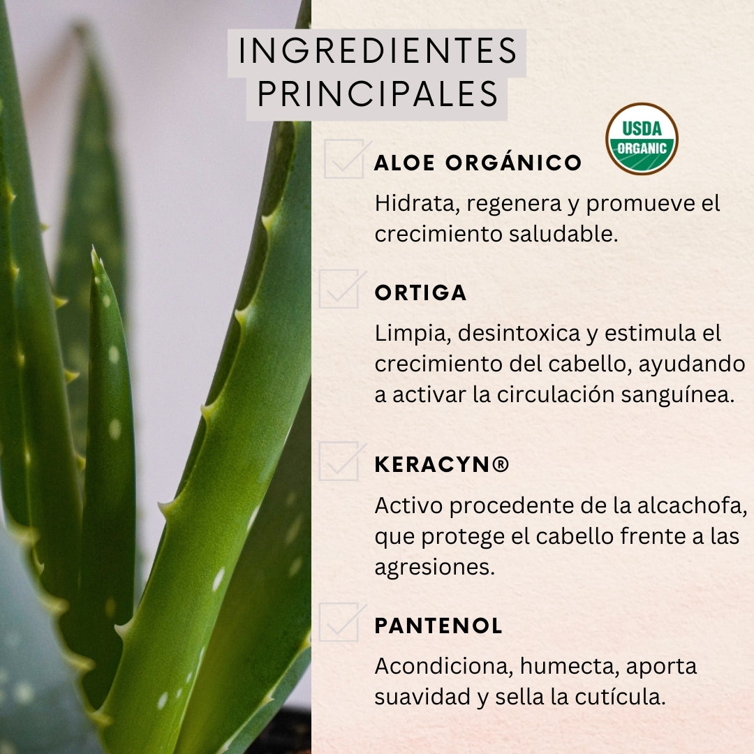 Aloe Orgánico: Promueve el crecimiento saludable, equilibra el PH, ayuda a evitar la caída del cabello.