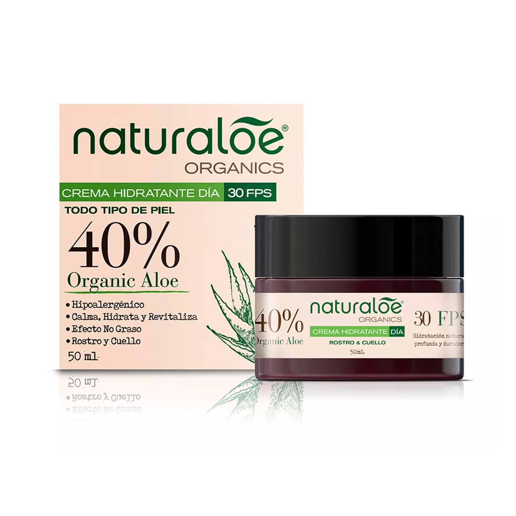 Último paso (día): Crema día con factor solar 30 formulado con 40% de Aloe Vera Orgánico + SPF 30, Jengibre, Maca + peptidos. 50ml