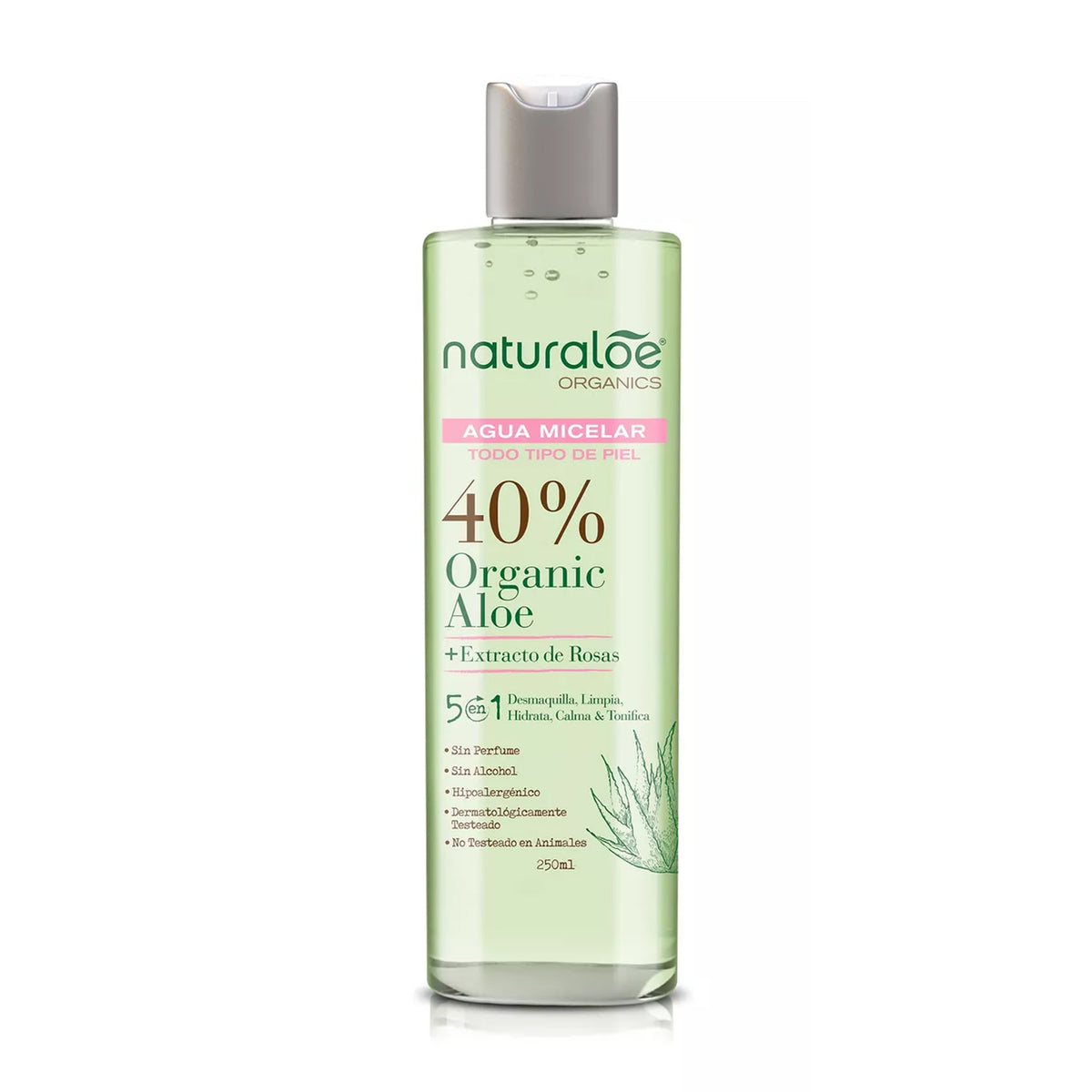 Paso 1 agua micelar: Formulado con 40% de Aloe Vera Orgánico + Extracto de Rosas